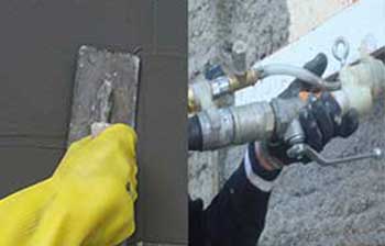 Remove the dust, loose particles, oil and grease from the surface to be plastered. Spray sufficient amount of clean potable water to neutralize the suction of the background. Allow free water to evaporate completely before the application of the cement plaster. Fixing of all attachments such as pipe, conduits, corner beads etc must be carried out before the plastering is begun. The gap of conduits must be tightly packed with cement, sand mortar. In order to maintain the straightness of the plastered surface, the surface condition of the block wall must be examined before the plastering and accordingly the dabs of the plaster mortar must be fixed to maintain plumb and minimum thickness level of the final plaster/render.